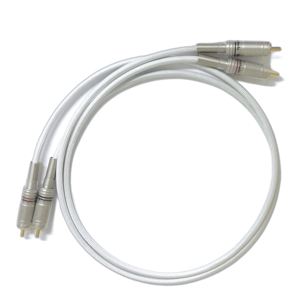 導体被覆には比誘電率の低いフッ素樹脂(PTFE)を使用。外部絶縁体には白い輝きが美しいガラス編組を採用。RCAプラグには嵌め合い精度の高さに定評のあるCANARE社のF-09を採用。